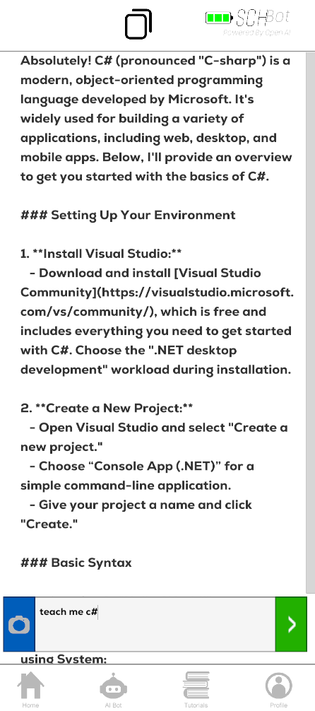 A social hub where developers can chat! Contains an AI chatbot, social feed, introductory C# tutorials, and a user profile.